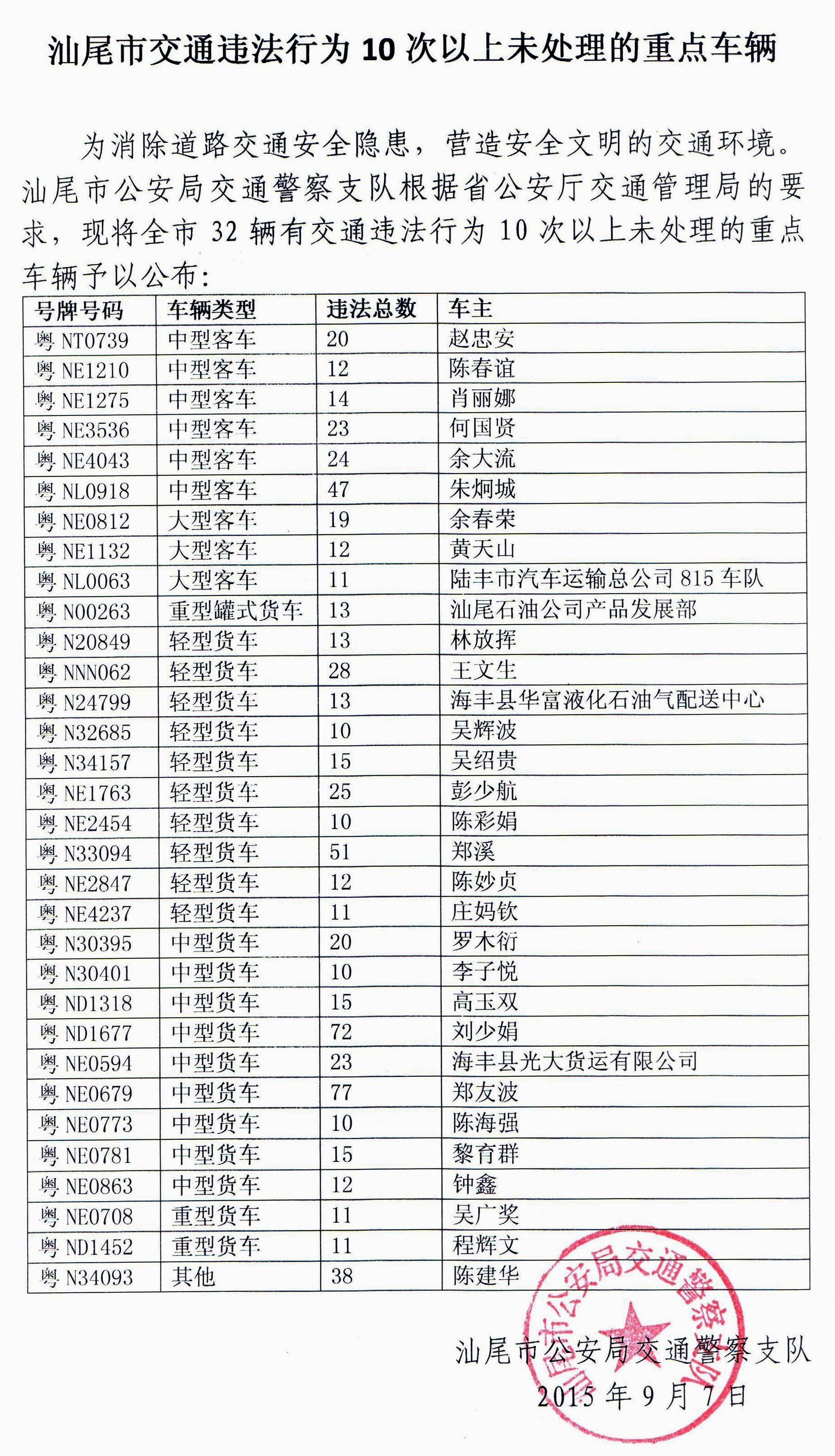 汕尾市交通违法行为10次以上未处理的重点车辆