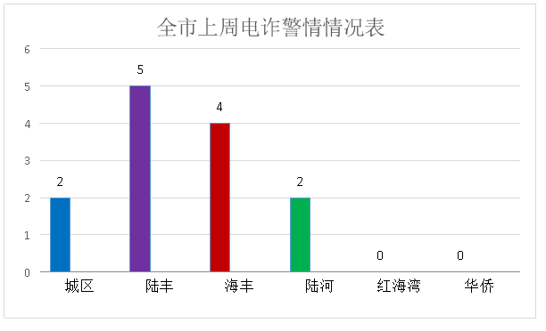 上周电诈警情中,城区警情发生在东涌镇、红草镇;海丰警情发生在梅陇镇、海城镇;陆丰警情发生在城东街道、湖东镇、碣石镇、铜锣湖农场;陆河警情发生在河田镇。电诈警情发生较多的镇街有海丰县梅陇镇、城东镇及陆河河田镇,均为2起。