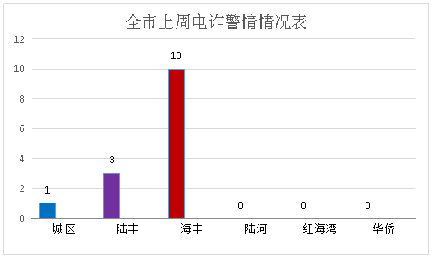 8月12日至8月18日,全市共接电诈警情14起,其中城区1起、陆丰3起、海丰10起。上周全市电诈警情类型主要是刷单返利类,网络游戏产品虚假交易类,贷款、代办信用卡类和冒充公检法及政府机关类,分别为3起、2起、2起、2起。