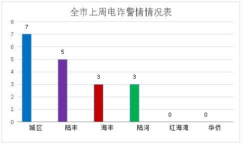 11月11日至11月17日,全市共接电诈警情18起,其中城区7起、陆丰5起、海丰3起和陆河3起。上周全市电诈警情类型主要是冒充电商物流客服类,虚假购物、服务类,贷款、代办信用卡类和刷单返利类,分别为5起、5起、3起和2起。
