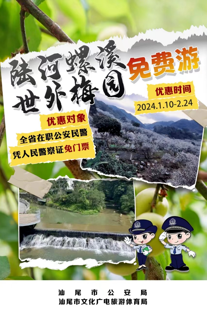 为庆祝2024年1月10日第四个“中国人民警察节”,汕尾市公安局、汕尾市文广旅体局重磅推出5处景区实行门票减免优惠活动,对全省在职公安民警免费开放。