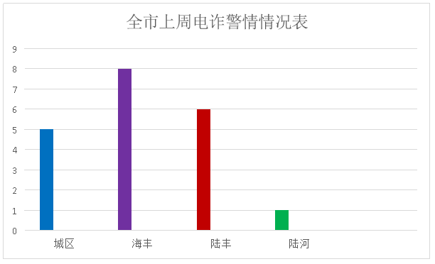 3月6日至12日,全市共接电诈警情20起,警情发生在城区、海丰、陆丰、陆河,分别约占25%、40%、30%、5%。