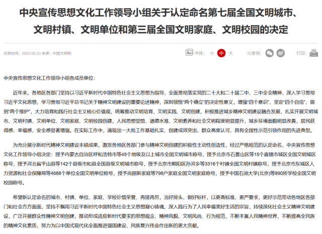 5月23日,《中央宣传思想文化工作领导小组关于认定命名第七届全国文明城市、文明村镇、文明单位和第三届全国文明家庭、文明校园的决定》发布,授予内蒙古自治区呼和浩特市等45个地级及以上城市全国文明城市称号,授予北京市石景山区等15个直辖市城区全国文明城区称号,授予河北省平山县等142个县级市和县全国县级文明城市称号,授予北京市朝阳区孙河乡等3316个村镇全国文明村镇称号,授予北京市东城区人力资源和社会保障局等4688个单位全国文明单位称号,授予尚丽新家庭等798户家庭全国文明家庭称号,授予中国石油大学(北京)等890所学校全国文明校园称号。