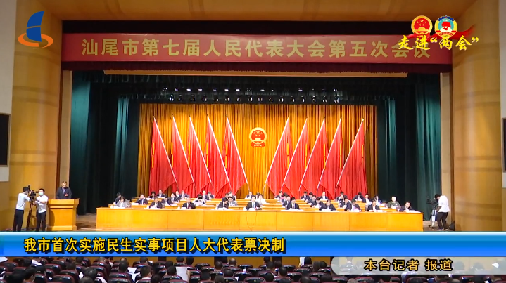 观众朋友,记者现在所在的位置是汕尾市第七届人民代表大会第五次会议的会场。在今年的会场上,记者发现了一个新物件表决器,这个表决器也是首次出现在(我市)人大会议的会场上,表决时与会的人大代表只需按动表决器上的赞成反对,弃权中的任意一键,显示屏上就会即刻出现表决结果,既方便又快捷,同时我市也是今年首次实施民生实事项目票决制这样一个制度。