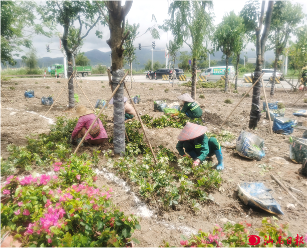 挥锹铲土、扶苗填坑、踏土夯苗、提水浇灌……在梅陇南入口项目种植现场,呈现出一片繁忙景象,在工作人员齐力耕植劳作下,一株株香樟、凤凰木、火焰木、山樱花、宫粉紫荆迎风拂动,为梅陇镇种下一条“绿美风景线”。