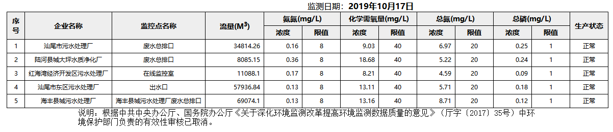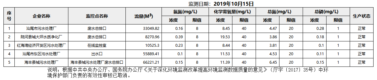 2019年10月14-20日汕尾市国控重点污染源废水企业自动监控数据报表