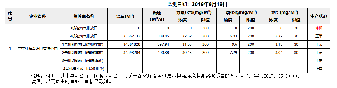 2019年9月19日汕尾市国控重点污染源废气企业自动监控数据报表