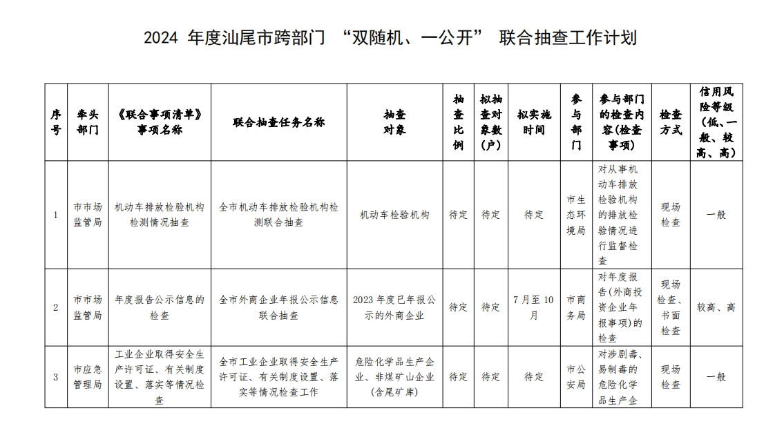 2024 年度汕尾市跨部门 “双随机、一公开” 联合抽查工作计划