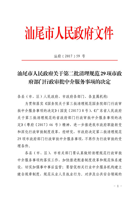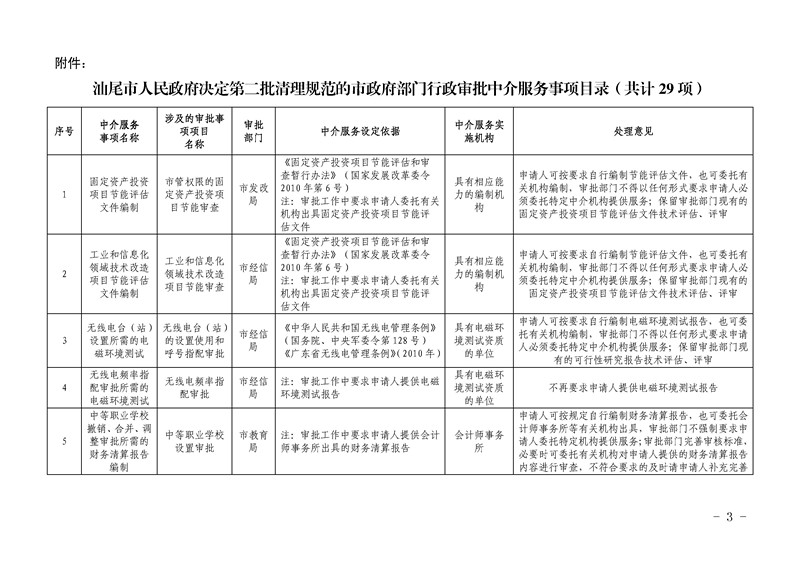 汕尾市人民政府关于第二批清理规范29项市政府部门行政审批中介服务事项的决定