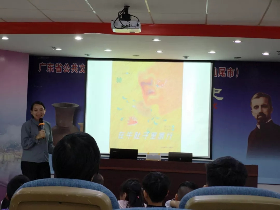 活动现场,志愿者老师为现场的小朋友们讲述了一个有趣的科普故事——《在牛肚子里旅行》,故事描述了红头蟋蟀被牛吃进了肚子里经历了一场惊险的旅行,最终在青头蟋蟀的鼓励下和帮助下,终于想办法逃出来的故事。志愿者老师用她甜美的声音、孩子般的口吻生动地讲述了《在牛肚子里旅行》的绘本故事,以做游戏、问答互动的方式引领小朋友们走进神奇而有趣的绘本故事之中,志愿者老师在分享绘本故事的同时还不忘鼓励每一位小朋友发挥想象力,放飞想象力,积极踊跃举手表达自己的想法,展示自己丰富的想象力。