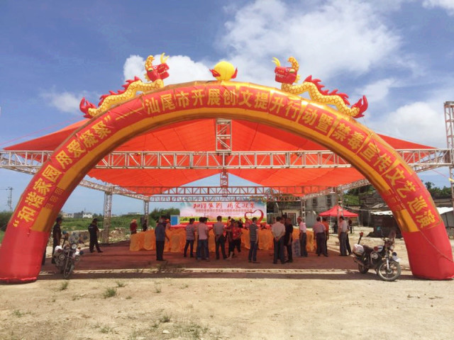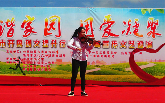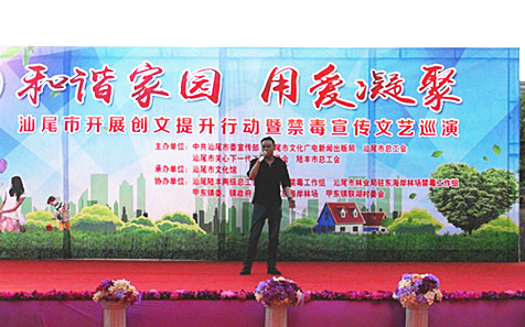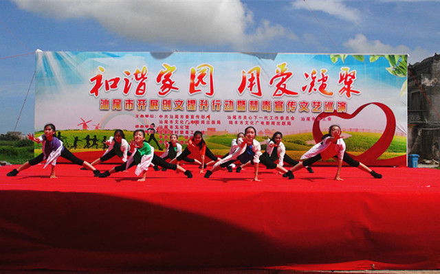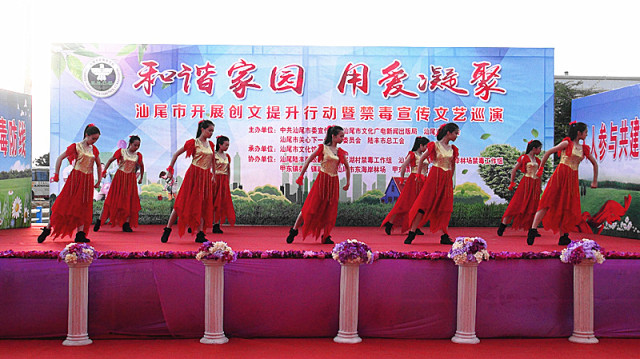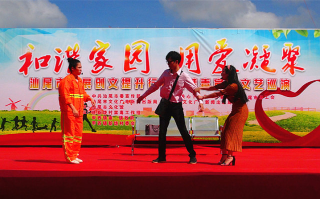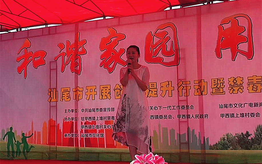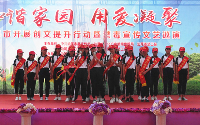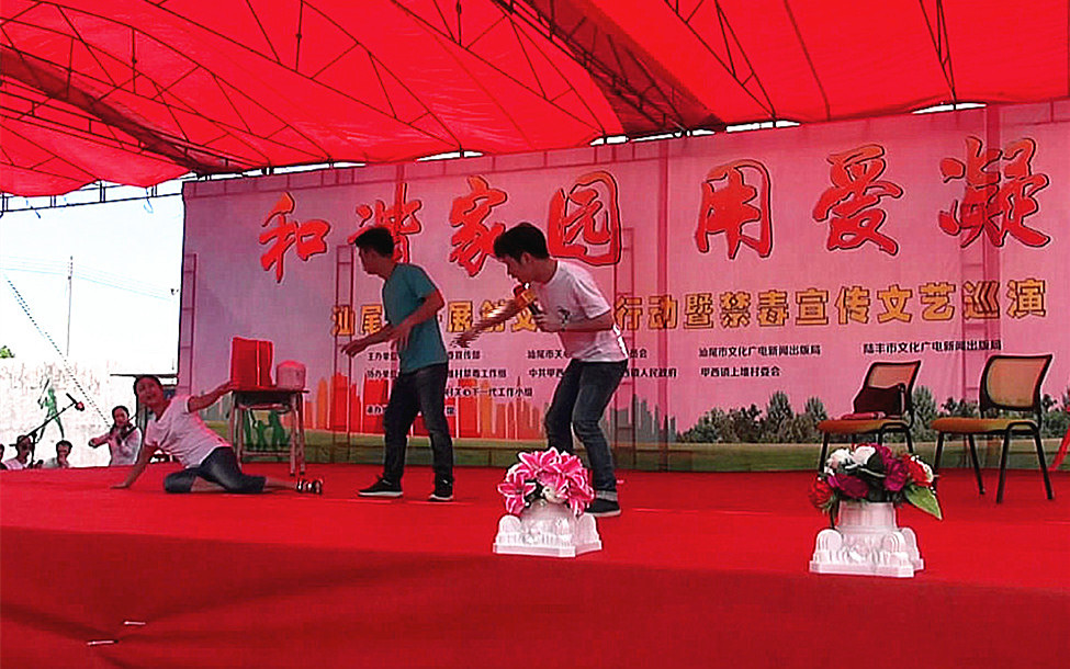 为进一步推进创文创卫工作的深入开展,全面提升市民文化素质和社会文明程度。根据市委市政府工作部署和《汕尾市开展创建文明城市“十大整治”、“十大提升”行动的实施方案》精神,结合我市禁毒宣传教育工作纵深开展的要求。6月26日,由中共汕尾市委宣传部、汕尾市关心下一代工作委员会、汕尾市文化广电新闻出版局、汕尾市总工会联合主办,汕尾市文化馆承办,汕尾、陆丰关工委驻甲西镇上墩村,汕尾、陆丰文广新局驻甲西镇新饶村,汕尾、陆丰总工会驻甲东镇联湖村等禁毒整治工作组,甲西、甲东镇委、镇政府,上墩村、新饶村、联湖村村委会协办的“和谐家园 用爱凝聚”——汕尾市开展创文提升行动暨禁毒宣传文艺巡演分别在陆丰市甲西镇上墩村、新饶村、甲东镇联湖村举行。