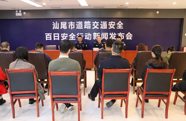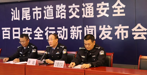 2018年12月29日下午,汕尾市交警支队举办“百日安全”专项行动新闻发布会。汕尾市公安局党委委员、副局长李越出席会议并做工作报告。