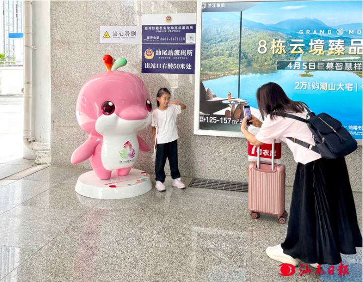 近日,到达汕尾高铁站出站大厅的旅客与现场的十五运会吉祥物“乐融融”合影留念。