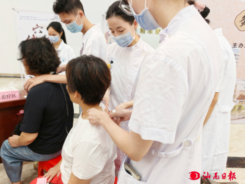 汕尾日报讯 (记者 陈晓铭 文/图) 7月10日,广州中医药大学第一附属医院深汕医院联合市委老干部局、汕尾广播电视台在市老干部大学开展“医心向党,健康同行”巡回义诊暨“‘灸’除湿伏正当时,中医惠民暖人心”三伏天灸养生活动,为老年干部和群众进行三伏贴敷,让更多群众享受到家门口优质便捷的中医医疗服务。