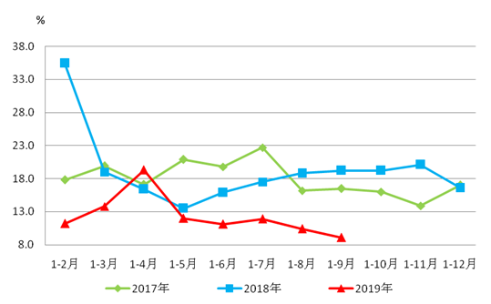 图2 2017年-2019年前三季度汕尾固定资产投资增速曲线图