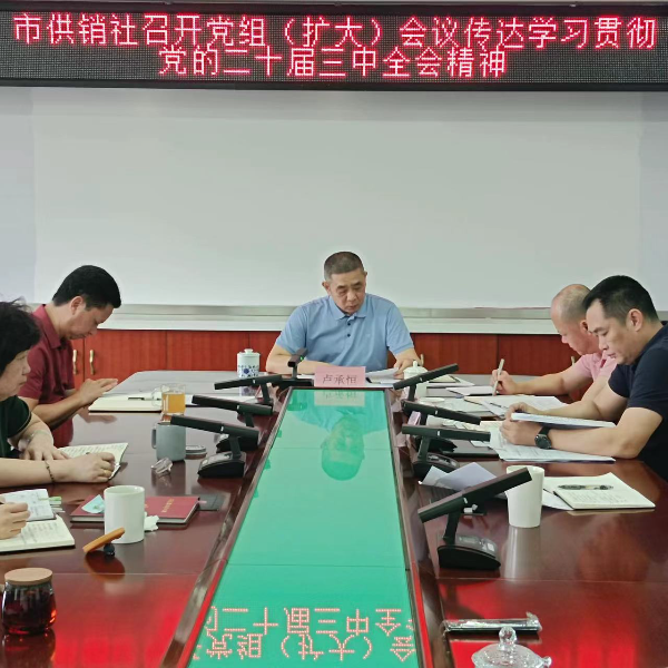7月30日上午,市供销社召开党组(扩大)会议暨理论学习中心组学习会,传达学习贯彻党的二十届三中全会精神,动员市社全体党员干部从全局和战略高度持续增强谋改革抓改革的坚定性和自觉性,守正创新、苦干实干,以新担当新作为奋力推动我市供销合作事业高质量发展。市供销社党组成员分别作专题发言,市供销社党组书记、理事会主任卢承恒主持会议并部署贯彻落实。
