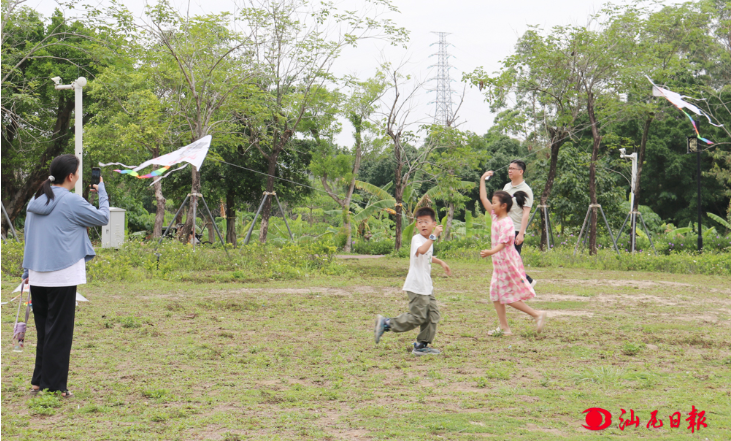 孩子与家长一起放飞美丽的风筝,享受假日的乐趣。