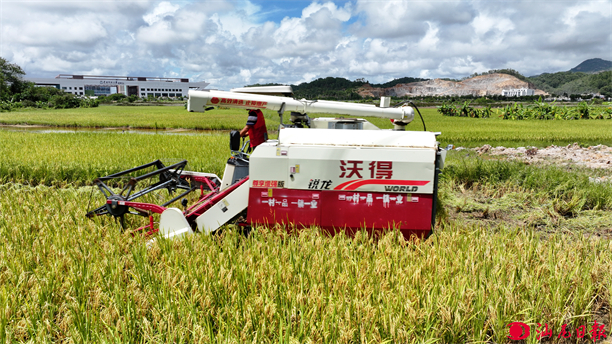 6月20日,城区马宫街道的稻田里,收割机穿梭作业,饱满低垂的稻穗被卷入机仓,脱粒、装袋,一气呵成。农户陈大叔望着金灿灿的稻谷,脸上洋溢着抑制不住的喜悦:“这批新引进的水稻品种太给力了!从播种到成熟才105天,比往年品种足足提前了20多天,不仅节省了大量时间,还让我们少费不少精力。”
