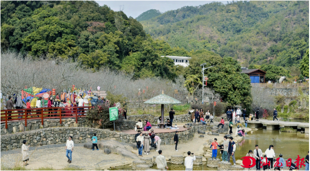 ▲梅花节期间,游客在螺洞世外梅园赏花游玩。