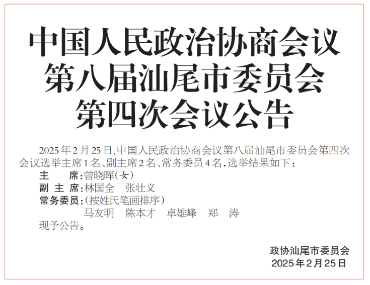 中国人民政治协商会议第八届汕尾市委员会第四次会议公告