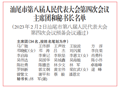 汕尾市第八届人民代表大会第四次会议主席团和秘书长名单(2023年2月2日汕尾市第八届人民代表大会第四次会议预备会议通过)