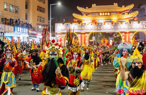 大会还举行了民俗文体汇演大巡游。巡游队伍从玉台山慈云公园出发,沿着汕尾大道、奎山桥、文明路、二马路、妈祖文化广场行进,最终到达关帝庙。其间,精彩的民俗文体表演轮番登场。五色狮腾跃灵动、龙舟花车绚丽夺目,汉服秀尽显中华礼仪之美,汉旗队列阵威武,二十四节令鼓铿锵有力,戏剧关公扮相惟妙惟肖;台湾金门昊天将首表演队、台湾关庙队带来特色展演,两岸青年醒狮队同台献艺、共展风采,巡游队伍宛如一条金龙舞动在冬至的滨海之夜。沿途人山人海,无人机低空盘旋记录精彩瞬间,广大市民热情参与互动。两岸民俗在巡游中碰撞交融,生动诠释了“同根同文同俗、两岸一家亲”的主题。