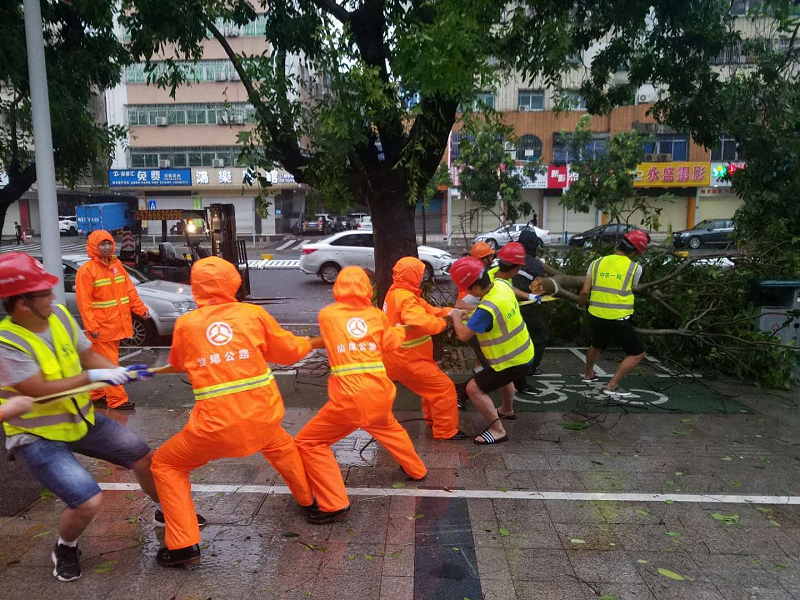三、 积极行动,全力以赴做好抢险救灾工作。9月16日超强台风“山竹”逼近我市海面,最大风力达14级,对管养公路各条线路的路基、路面、路树、标志、边坡等造成严重破坏。在风力减弱后,公路应急抢险队伍迅速出动,采用分组、分段的方式,奔赴各条受灾路线,连夜冒雨积极奋战,利用挖掘机、装载机、油锯、运载车辆、柴刀、应急灯等机械和工具,全力对管养的各条线路、路段进行清障,及时消除影响交通行车安全的隐患。其中,汕尾市公路局属下单位市区公路养护中心组织4支抢险小分队,64人,紧急调用26台应急抢险设备,到国道236线西闸至遮浪路段、省道S241线顶盖山至品清村委会、赤岭至新湖村、西河村至长沙村入囗等受灾严重路段清理倒塌路树、广告牌及铁皮等障碍物。经过三个多小时的道路抢通工作,以上路段全面恢复正常交通。与此同时,市政代建工程项目防御小组同各工程项目工作人员也第一时间奔赴受灾现场,先后到香洲路、康平路、海滨大道及红海东路西段分组开展抢险救灾工作。各抢险队员齐心协力、各司其职,绿化抢修组队员清理倒伏路树、广告牌等障碍物,安全设施抢修组队员修复被台风吹倒的中间护栏。据统计,市政项目投入抢修人员共146人,挖机6台,铲车2台,叉车3台,小型发电机4台,水泵7台。经过连夜抢修,以上道路已基本完成清理路障及抢修中间护栏等工作,保证了市区各交通要道的正常通行。