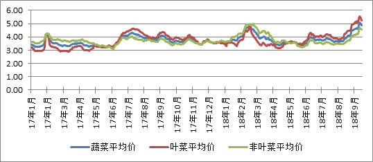 蔬菜价格明显上升。7月以来,暴雨及台风天气频繁,蔬菜的生产和调运受到一定影响,供应收紧,菜价持续上升,特别是9月中旬超强台风“山竹”登陆我省,进一步压缩蔬菜供应,导致菜价进一步上涨,与二季度相比,三季度纳入监测的30个蔬菜品种出现全面上涨,平均零售价上升31.9%,其中叶菜类上涨42.8%,非叶菜类上涨23.6%,有18个品种涨幅超过20%。与去年同期相比,升幅也较为明显,平均零售价同比上涨18.8%,其中叶菜类上涨21.9%,非叶菜类上涨16.4%。