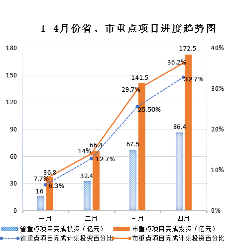 汕尾市2024年重点建设项目367项,项目总投资4492.7亿元,年度计划投资476.4亿元,截至4月底,累计完成投资172.46亿元,完成年度投资计划的36.2%,超序时进度2.9个百分点。我市列入2024年省重点建设项目65项,项目总投资2526.2亿元,年度计划投资264.2亿元,截至4月底,累计完成投资86.4亿元,完成年度投资计划的32.7%,比去年同期提高了2.24个百分点。