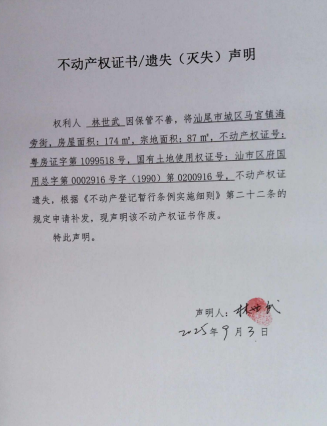 不动产权证书遗失(灭失)声明(林世武)