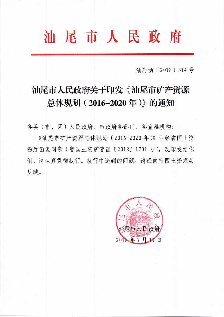 汕尾市人民政府关于印发《汕尾市矿产资源总体规划(2016年-2020年)》的通知