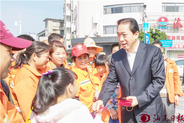 杨绪松(前排右一)慰问城区新港环卫站环卫工人。
