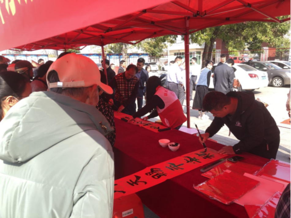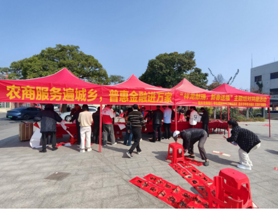 为深入推进文明单位与新时代文明实践所思想共建、精神共育、资源共融、文明共创、成果共享,持续丰富文明实践活动内涵,2024年1月12日上午,陆丰农商银行联合甲东镇新时代文明实践所、陆丰市甲秀书画社、艺美轩书画馆在甲东镇政府门前禁毒广场开展“祥龙献瑞,新春送福”主题结对共建暨送春联活动。陆丰农商银行行长林栋、甲东镇人民政府镇长黄伟旭、党委委员陈映慧现场指导。