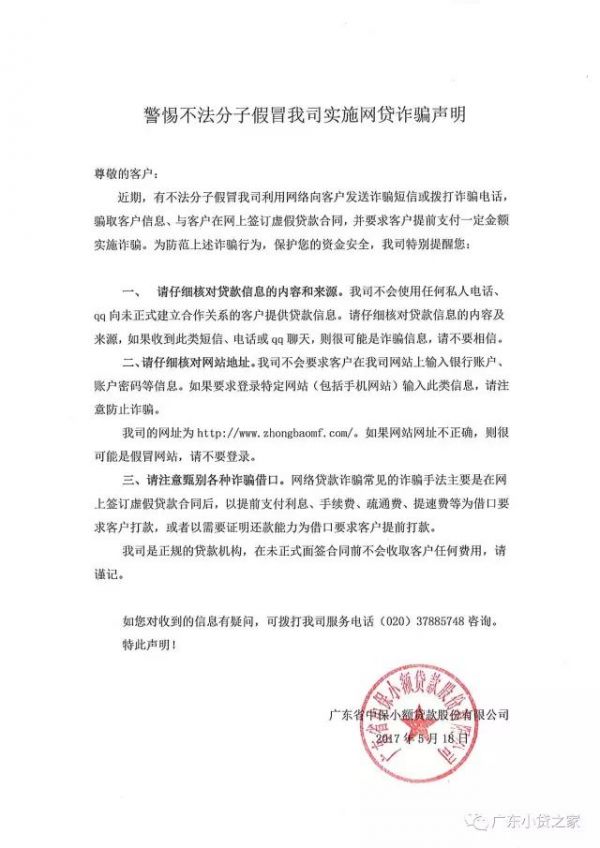 关于警惕不法分子假冒广东省小额贷款公司协会会员单位实施网贷诈骗声明的公告
