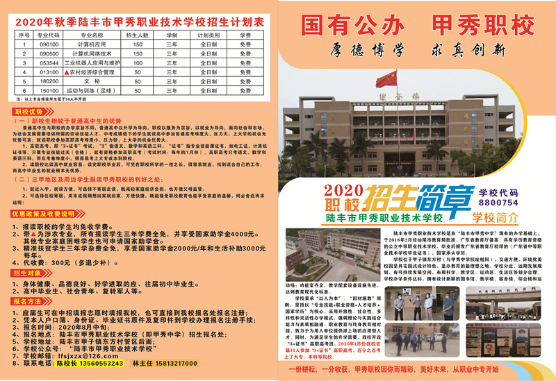 2020年秋季陆丰市甲秀职业技术学校招生计划表