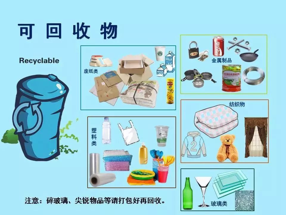 可回收物就是再生资源,指生活垃圾中未经污染、适宜回收循环利用的废物主要包括废弃电器电子产品、废纸张、废塑料、废玻璃、废金属等五类,是现阶段生活垃圾分类的主要工作和影响垃圾减量的重要因素。(一)电器电子产品类废弃计算机、打印机、复印件、传真机、扫描仪、投影仪、电视机、空调机等。(二)纸类1、平面纸张:报纸、复印纸、宣传单、包装纸、信封、硬纸板等;2、纸盒(箱):纸板箱、包装盒(如点心盒、纸巾盒)、牛奶(饮料)利乐包装等。(三)塑料类1、瓶类:PET塑料瓶(矿泉水瓶、饮料瓶)、硬质塑料瓶;2、其他容器类:塑料盒(如冰激凌盒)、塑料杯(如酸奶杯、果冻杯)、软桶等;3、包装类:塑料袋、保鲜袋(膜)、包装袋(如零食包装袋、快递包装袋)、塑料泡沫、气泡缓冲材料、水果网套、热饮(如咖啡杯)杯盖等;4、其他塑料制品:废弃塑料文具等。(四)玻璃类玻璃瓶、白炽灯泡、碎玻璃、其他玻璃制品。(五)金属类金属罐(如易拉罐)、金属盒、其他金属制品、金属文件柜佩奇一句话,总结可回收物: