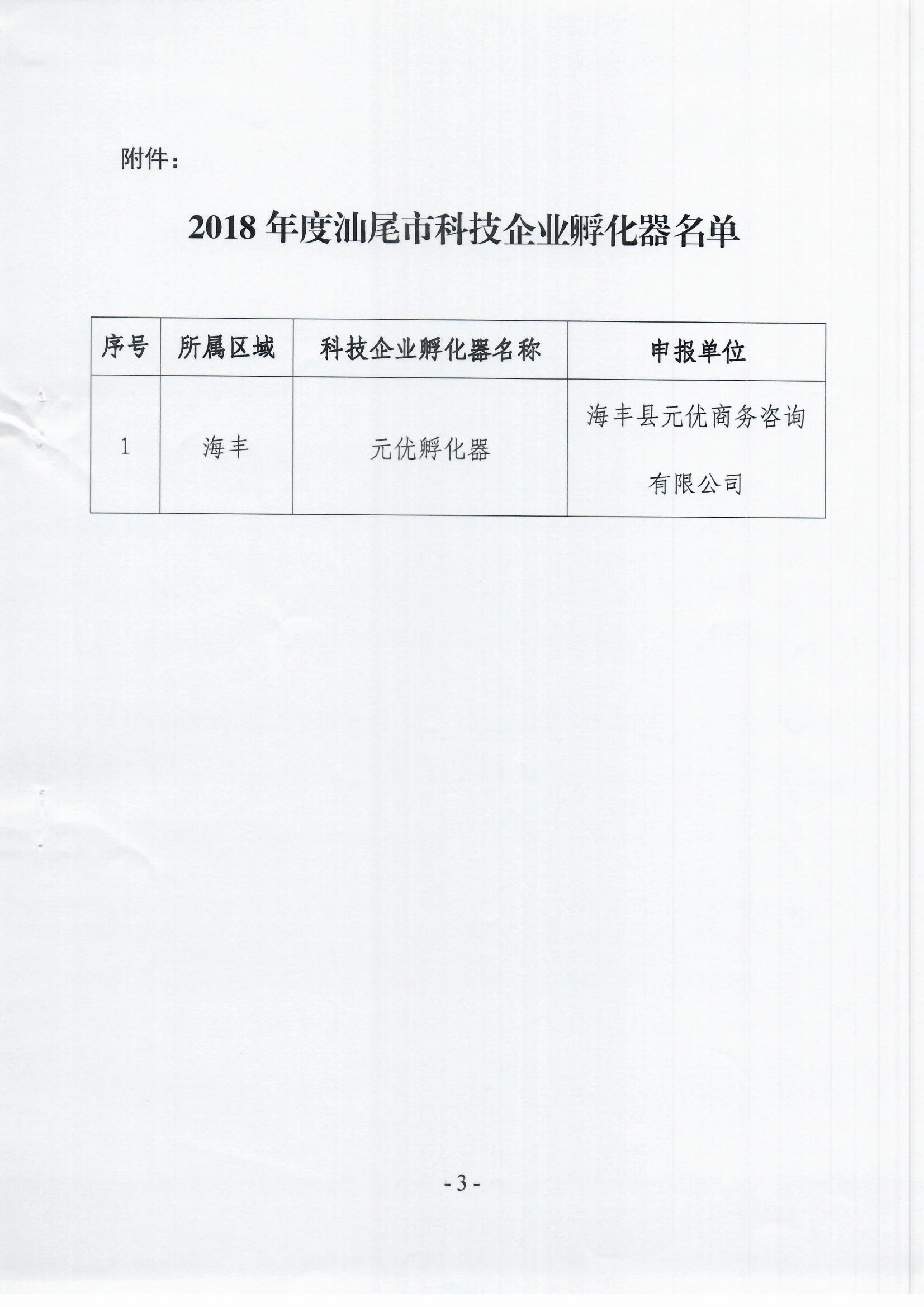 关于认定2018年度汕尾市科技企业孵化器的通知