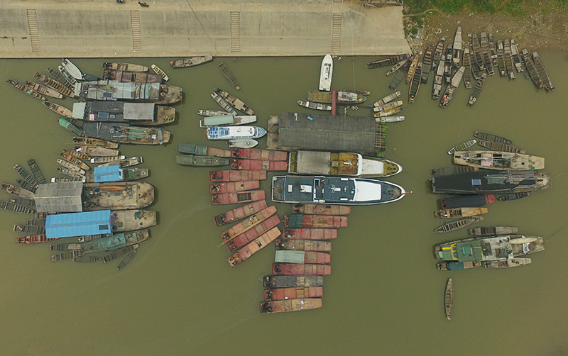在湖南常德汉寿县蒋家嘴镇,待回收的铁渔船停靠在洞庭湖边(2019年12月17日摄,无人机照片)。2020年1月1日零时起,长江流域332个自然保护区和水产种质资源保护区全面禁止生产性捕捞。新华社记者 薛宇舸 摄