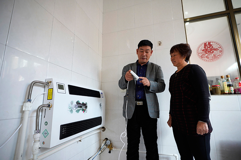 河北省隆尧县杨河村村委会委员王梦云(左)在给村民魏贵芬讲解电采暖设备的使用方法(2019年10月31日摄)。新华社记者 邢广利 摄