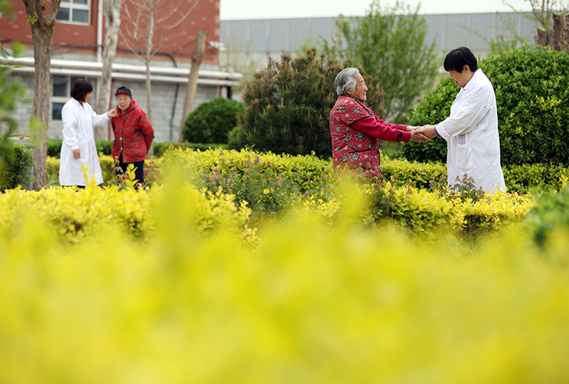 在河北省衡水市桃城区一家养老康复医疗中心,护工在陪老人散步(2019年5月5日摄)。新华社记者 牟宇 摄