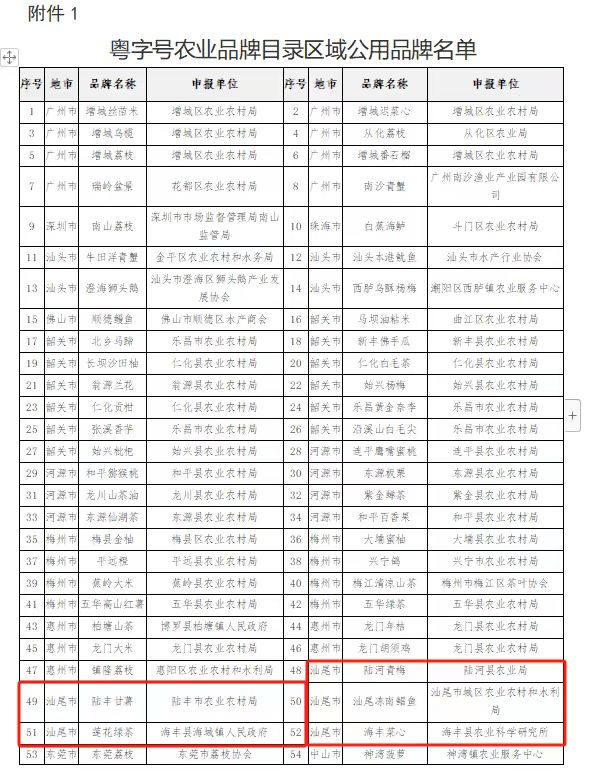 据了解,此次汕尾市共有五个区域公用品牌上榜,分别是陆河青梅、陆丰甘薯、汕尾冻南鲳鱼、莲花绿茶和海丰菜心。