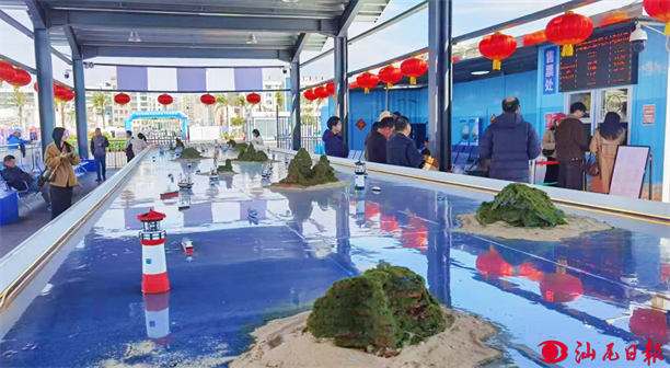 在海港文旅码头,红灯笼高高挂起在候客大厅四周,节日氛围浓厚;大厅中间还摆放着大型海洋场景模拟沙盘,布置模拟出海域、小海岛以及各类船舶,作为船舶科普宣传供等待登船的市民游客参观。大年初一,记者在候客大厅看到,市民游客正在参观大型海洋场景模拟沙盘,等候“蓝海豚6”停靠码头。据了解,目前,客船“蓝海豚3”环品清湖航线每天开设3个航班;“蓝海豚6”龟龄岛航线每天开设8个航班。