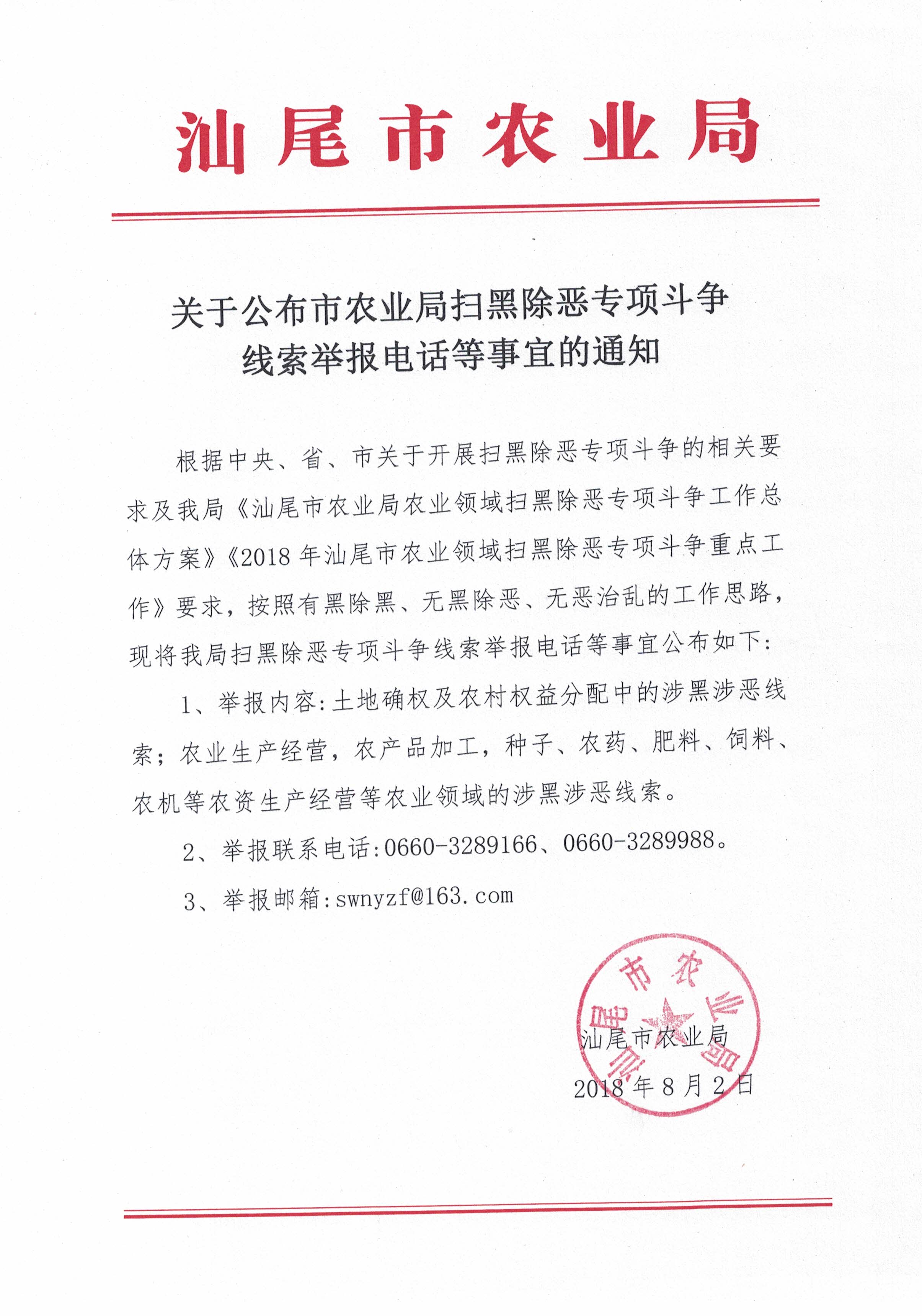 关于公布市农业局扫黑除恶专项斗争线索举报电话等事宜的通知