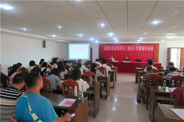 为深入学习贯彻习近平新时代中国特色社会主义思想、党的十九大和习近平总书记关于全面依法治国的精神, 9月14日,我局邀请市人大常委会副主任吴友深作《学习宪法知识,领会宪法精神》专题辅导报告,局党组成员、副局长刘石兰主持,市农业局班子成员,局机关、市畜牧兽医局、下属事业单位全体干部职工参加辅导报告会。