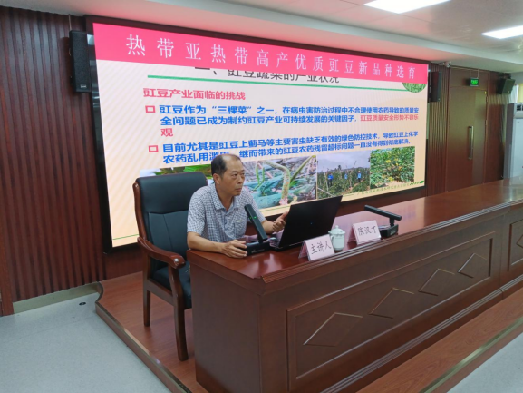 陈汉才研究员以《长豇豆绿色高效栽培技术模式》为题,对豇豆的整个生产过程进行了仔细讲解。内容涵盖了豇豆蔬菜的产业状况、豇豆概况与简介、生物学特性、对环境条件的要求、栽培技术、病虫害绿色防控技术、豇豆病虫防控现状分析及防控对策等七方面,特别对豇豆病虫害防治适时、选择适当药物和用药安全高效,紧密结合各地各生产季节等不同生产情况,进行详细深入讲解,实践性强、措施方法得当,参加培训的同志纷纷表示受益很大。