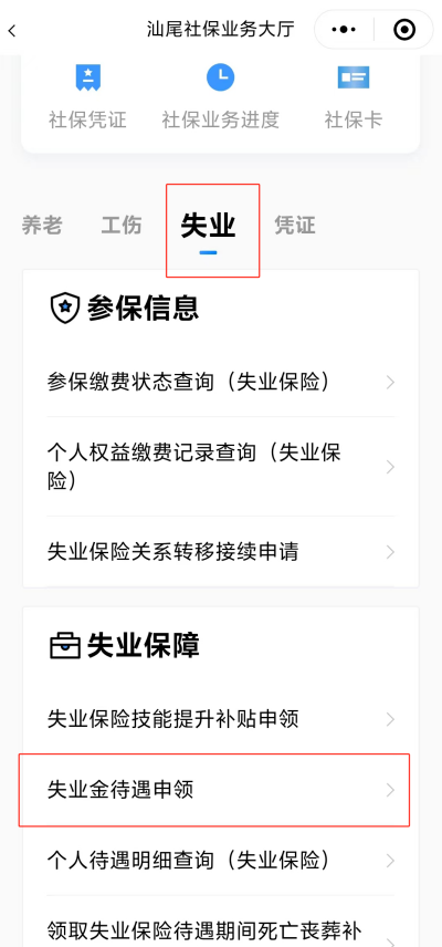 第一步:打开微信搜索“粤省事”→登录“粤省事”→定位选择“汕尾市”→点击热门服务里的【社保】,在失业版面的“失业保障”模块选择“失业金待遇申领”,再选择“失业金待遇申领”服务。
