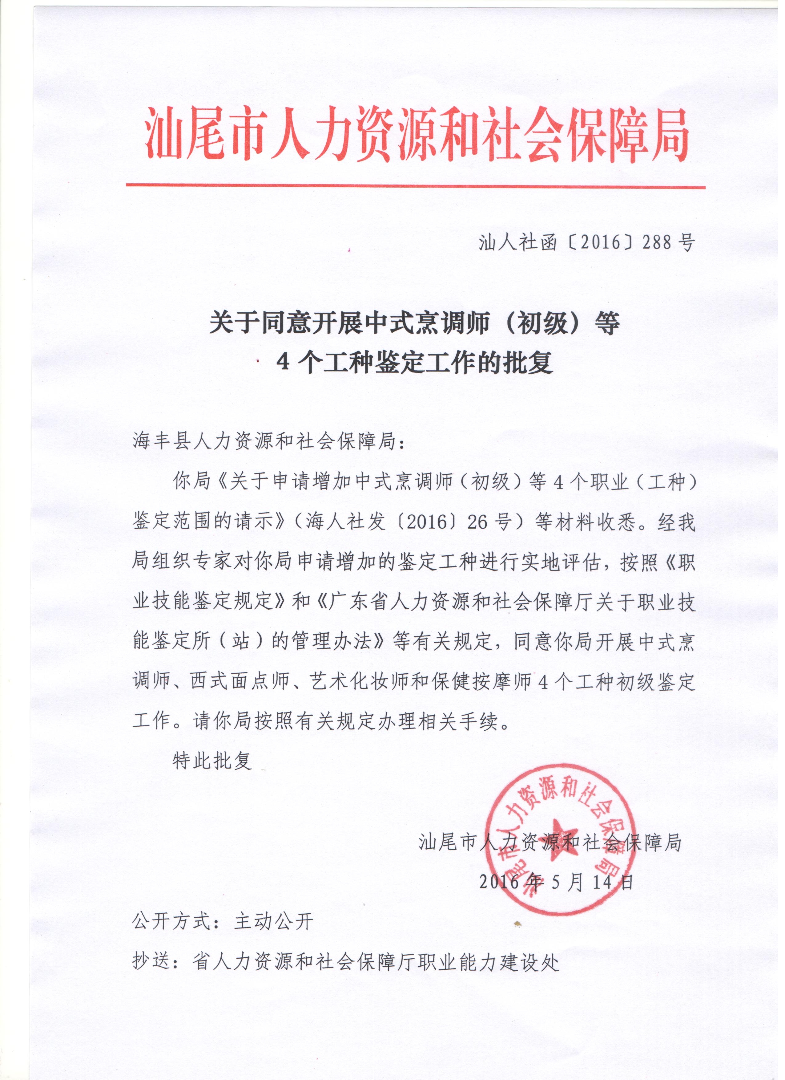 关于同意开展中式烹调师(初级)等4个工种鉴定工作的批复