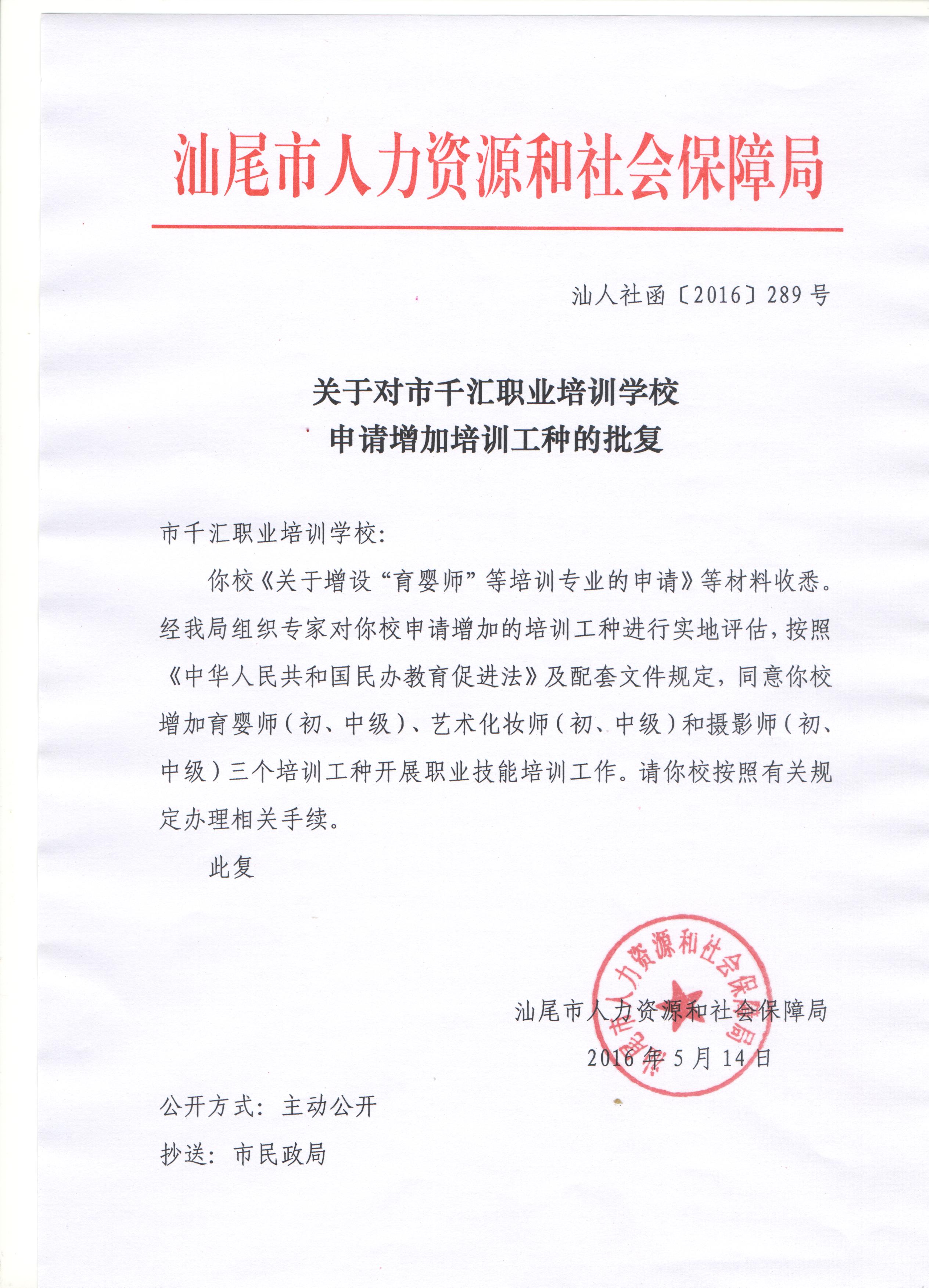 关于对市千汇职业培训学校申请增加培训工种的批复