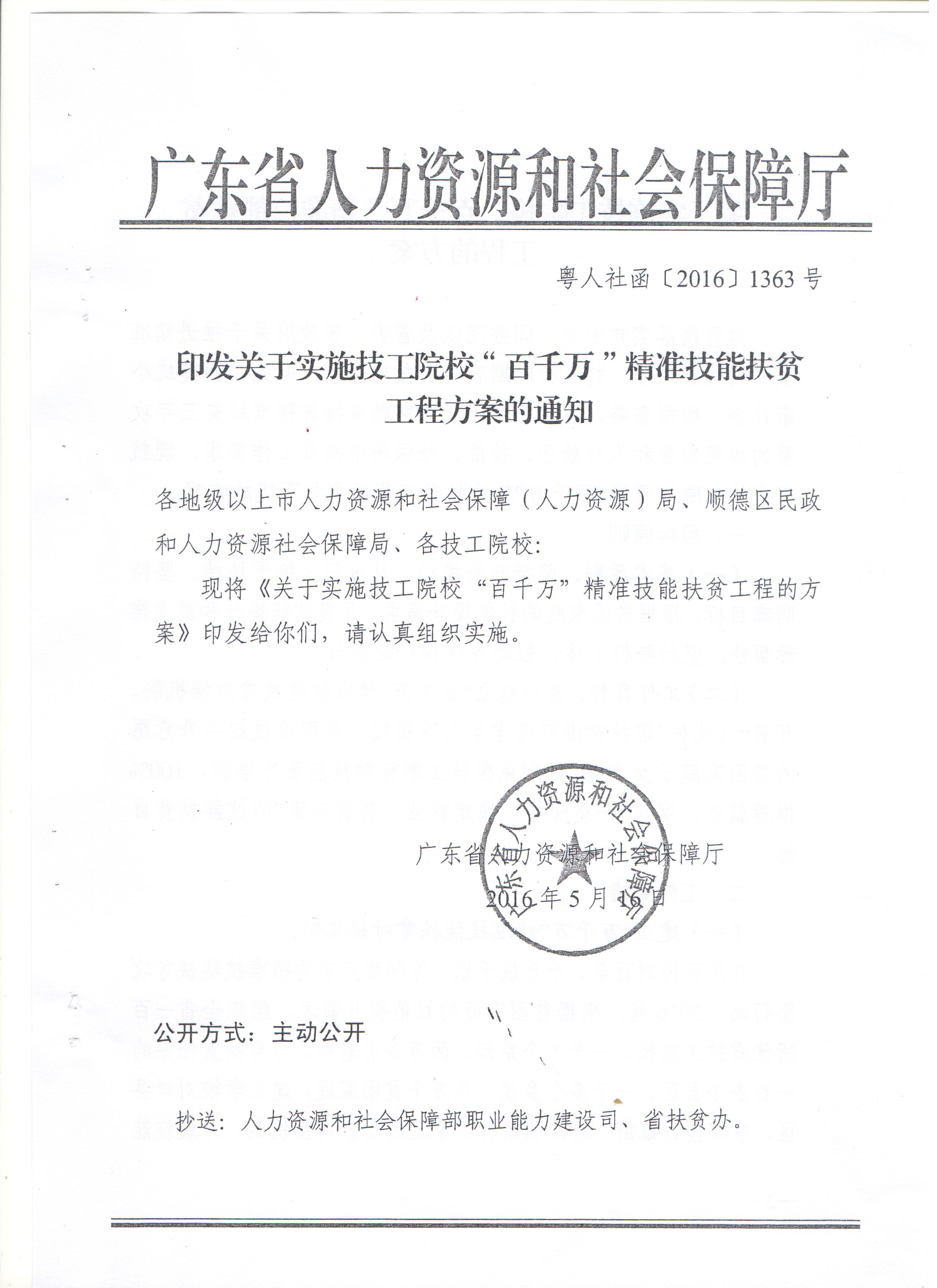 转发印发关于实施技工院校“千百万”精准技能扶贫工程方案的通知