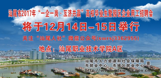 招聘会名称:汕尾市2017年“一企一岗·互济共赢”高校毕业生暨园区企业用工招聘会 时间:2017年12月14日(星期四)至15日(星期五) 地点:汕尾职业技术学院A区